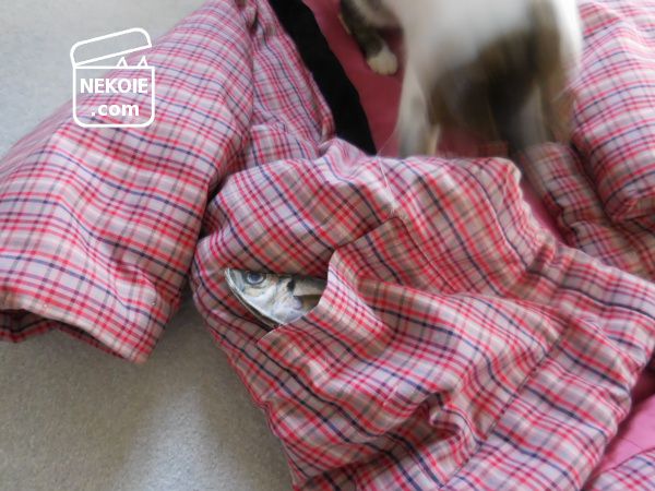 着る毛布やセーターのときもそうだったのですが、私はこういった衣類にも猫といっしょに心地よく活用できることを望んでいます。あたたかさ、さわり心地のよさ、そしてポケットのちょっとした収納力。そこにおもちゃを収めて猫に楽しんでもらうことも。