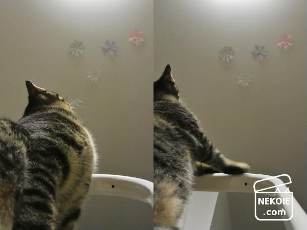 天井に飾りを貼れば、目ざとく見つけ。