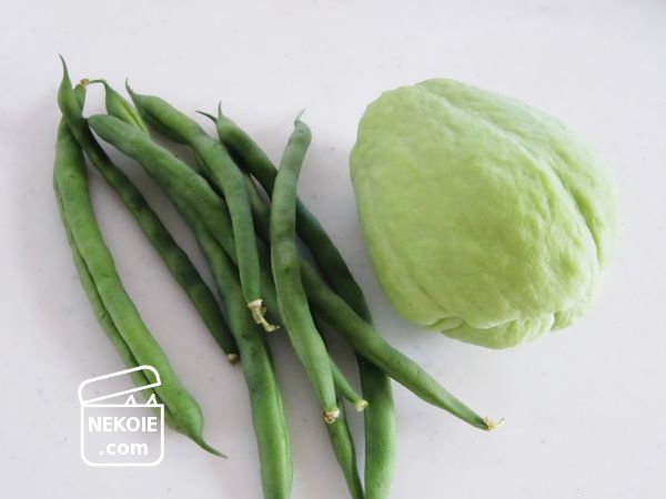 - ハヤトウリは薄切り(食べやすい大きさ)にしてから、水に10分晒してあく抜きをする。