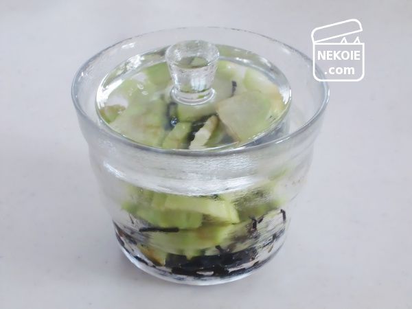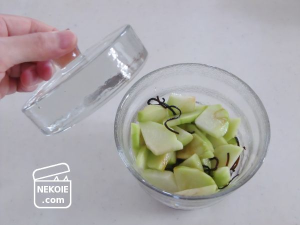 - 水を切ったら漬け鉢へ。塩昆布と交互に重ねていく。