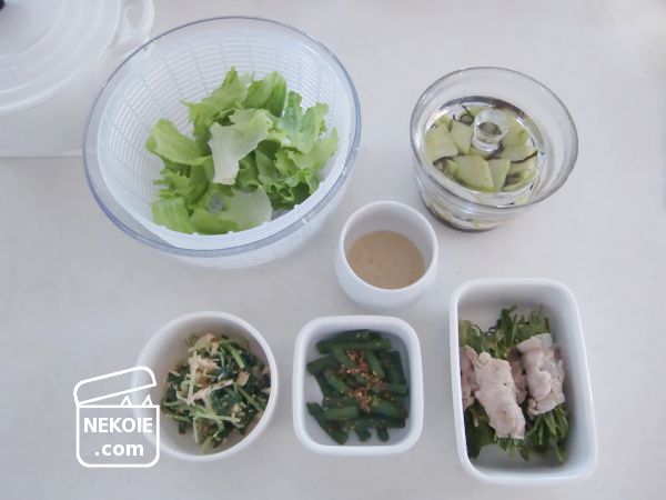 レタスは包丁いらず、手でちぎるだけ。余ったぶんはこのまま保存して翌朝の味噌汁の具などになっています。他のおかずもそんな具合に。