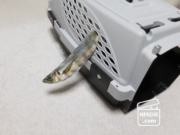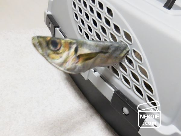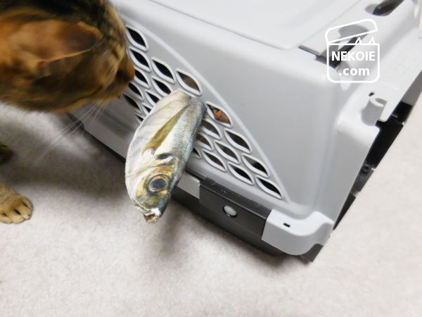 以前ブログに書いた本物そっくりなアジの開きのおもちゃを、猫のキャリーケースに挿して遊ぶのです。といっても挿したのは私なのですが、それを中から全力で引っ張るのが弟猫。
