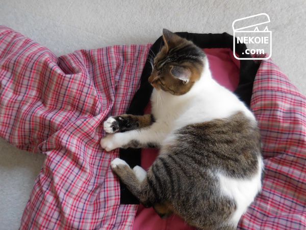 薄手のひざかけのときも猫を足の上にのせたまま仕事をすることはあったのだけれど、猫が動くたびにずれてしまったり、時には猫もろとも落としそうになったり、体重のかけどころが悪いと私の足(しびれ)に限界がきたり。試行錯誤が必要でした。