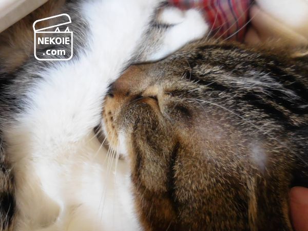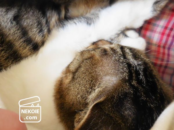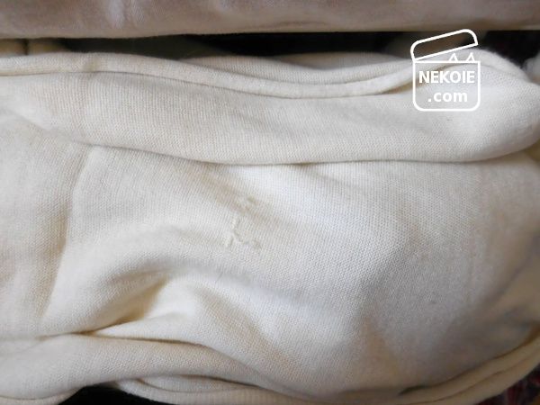 経年劣化でほつれてしまっているこの白い生地は、やはり猫たちと共用し続けている私のコットンストール。以前にもふれたものです。