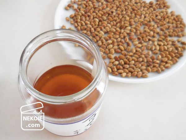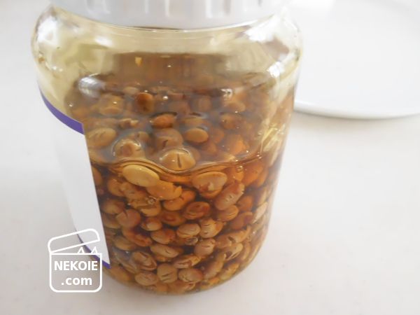 はちみつの容器は直接注げる(傾けて垂らせる)とんがりボトルのほうが使いやすいと思っていたけれど、こうして漬けこみにする場合はガラス瓶も便利。アーモンド用に中身を半分すくい出した瓶があったので、今回は中に残っているはちみつに福豆を投入しました。