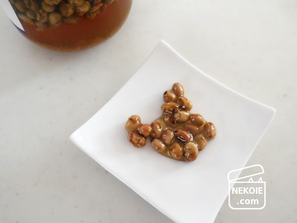 漬けこみ期間が五日程度なので、はちみつが豆の中にまでしみこむことはありませんでした。福豆の硬さや質感から考えると、よほど長く漬けこまない限りしみこまないかもしれません。逆に、漬けるというよりまぶす感覚で、はちみつを絡めたらすぐに食べてもよさそうです。