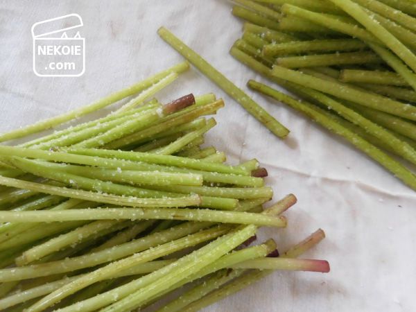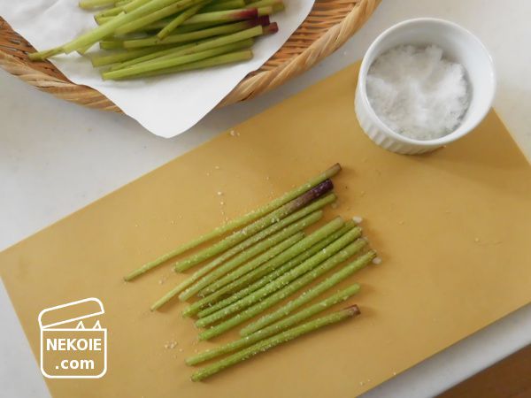 大体ひとつかみのふきに、ひとつまみ(親指・人さし指・中指の三本の指先でつまんだ量)の塩を使っています。