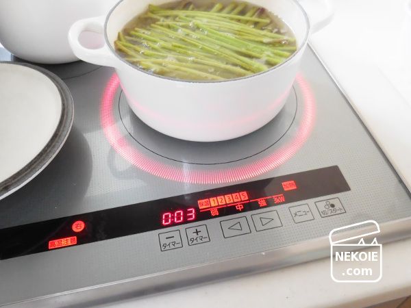 ゆで時間は、細い先の部分で3分程度、太い根元は5分程度が目安です。