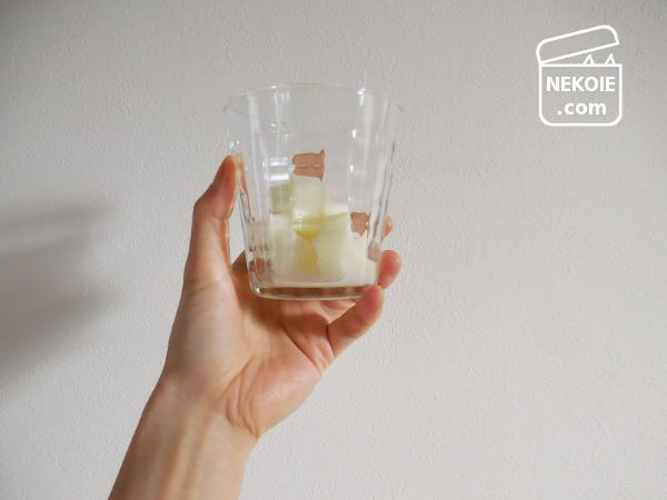 ただ多量の水を含んだ雪のようなべちゃべちゃした感触で、握りつぶせそうなくらいのもろい硬さになっています。製氷皿に使ったのがシリコン製だったのは幸いで、一般的な硬い素材のものではきれいに抜くのは難しかったかもしれません。