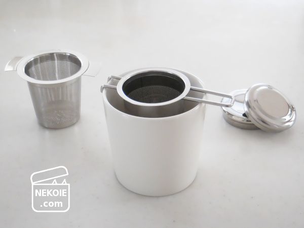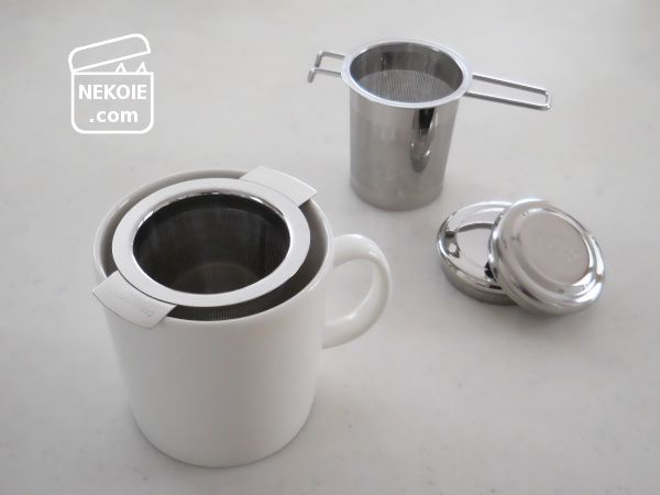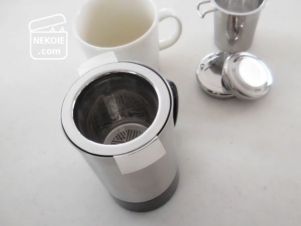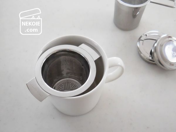 何かのはずみでずれてしまう、ということも過去には何度かありました。ただ最近は慣れてきたのと、このカップで飲むのがコーヒー中心になっていることもあり(お茶は別のカップを使うことが増えている)、トラブルを感じることもなくなっています。もとより多少ずれてしまっても写真のように途中でひっかかるので、お茶を淹れる工程での不便はほとんどありませんでした。