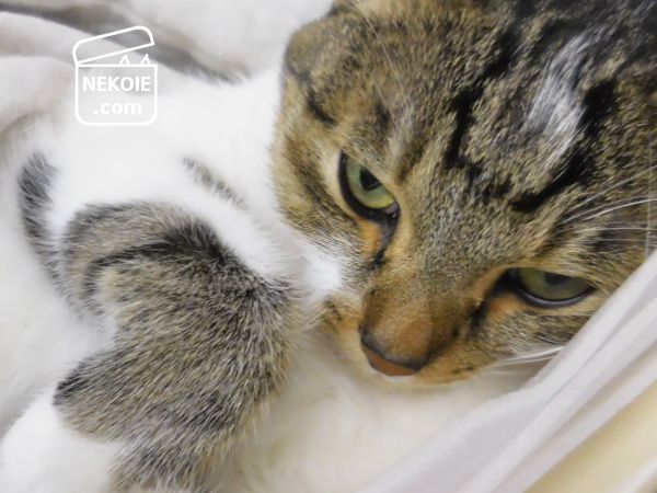 寝ている猫にガーゼケットをかけようとしたら、起こしてしまったようで……この表情。