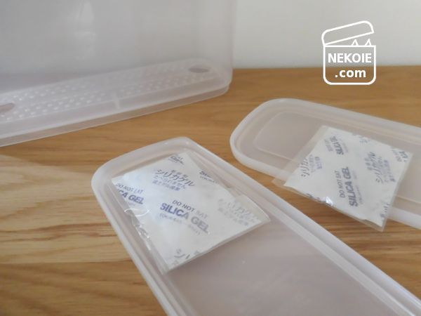 小麦粉類や乾物などの保存用容器にはシリカゲルを入れています。