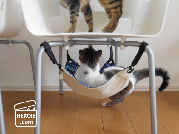 椅子の下のハンモックから、座面上で動く兄猫が見えて落ち着かない弟猫。