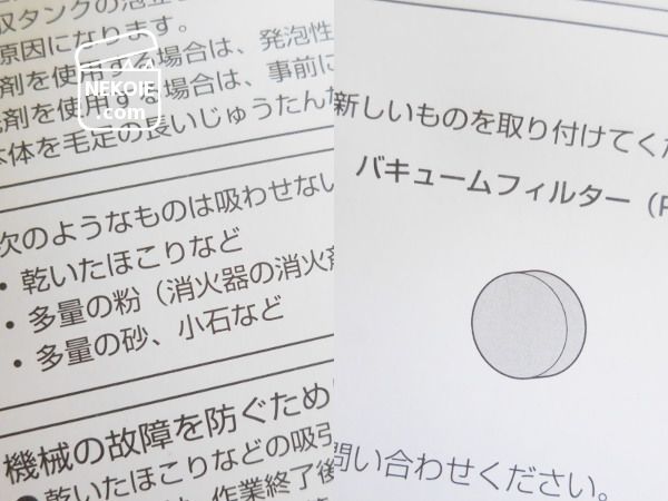 - 乾いた埃などの吸引には使えないため、掃除機の代用品にはならない(他、取説に手注意事項あり)。