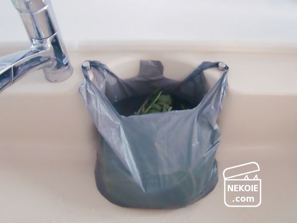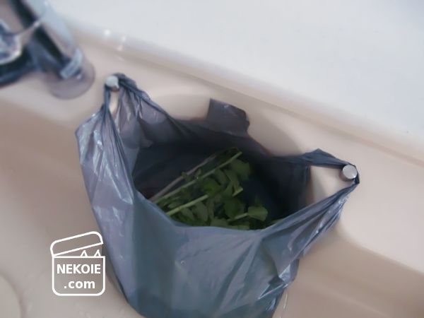 尚、浸け置きに使うポリ袋は野菜とともにいただいているもの。毎回色や形が異なるけれど、こんな形で活用し、可能であれば乾かしておいて何度か使い回し、最後は処分しています。