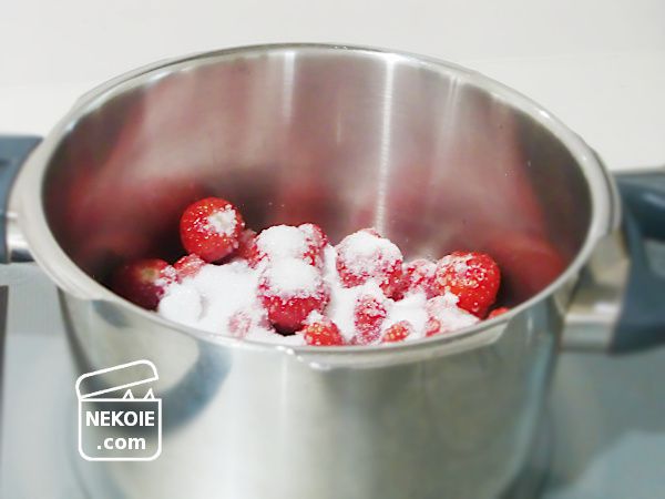 小粒のいちごが一パックワンコイン。すっぱいのかな……と思って食べてみたら、思いがけず甘くてびっくり。むしろ酸味がかなり控えめ。そのままデザートとして楽しもうかと思ったけれど、この量を数日間保存すると少しずつ傷み始めてしまいそうなので、やはり予定どおり煮ることにしました。