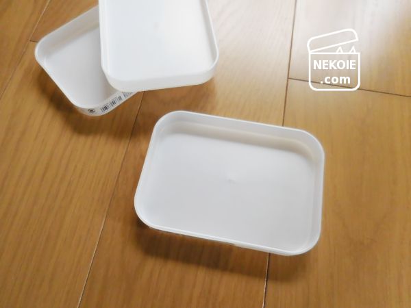 色の違いや、徒歩圏で手に入る気軽さなどを理由にこちらをお試しで購入。このときは収納グッズというより、猫たちのごはんのうつわをのせる受け皿のような形で選び、問題なく使っていました。