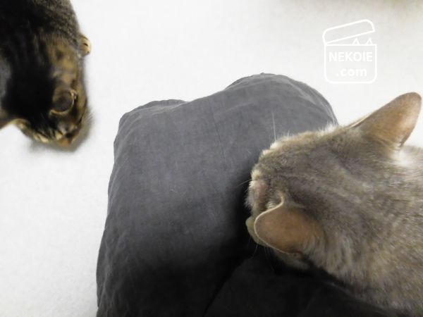リビングですごしているときは兄猫たちに遠慮して(?)人間と距離をとる弟猫。その代わりにいそいそと抱っこにくるのが兄猫。