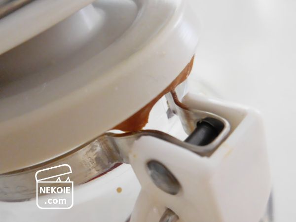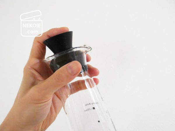 ただし、こちらは本来「ドレッシングボトル」。オイルや他の調味料などを加えて、シェイクして仕上げる容器です。ところがその用途で使った場合、オイルで蓋(裏側が空洞になっている)がべたべたになって使いにくいとか、シリコンの蓋とガラスの間にオイルが入りこむと密閉性が著しく落ちるとか、デメリットもあるようでした。