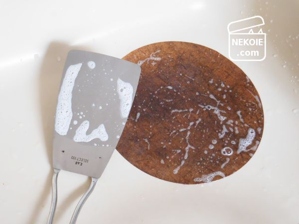 そこで棒たわしや、その時々で使った(これから洗う)ツールで、ワンプッシュの泡を広げてみることに。いつも付着している汚れや油はできるだけ拭き取ってから洗うため、広げた泡でも十分な洗い上りだと感じます。