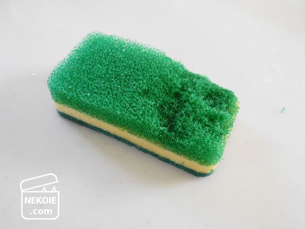 これは片づけを手伝っている知人宅で眠っていた、食器洗い用のスポンジ。手に入れたのは何年も前だそうですが、開かずの棚からスポンジが十個もニ十個も出てきたので、一ついただいてきたんです。といっても食器を洗うのではなく、「猫のトイレの丸洗い」に使わせてもらいたくて。