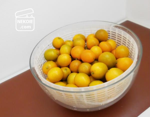 先日の柚子はご近所さんの庭で収穫されたものを分けていただけたのですが、金柑は地元産のものを購入しました。どちらも有難いことに無農薬品です。