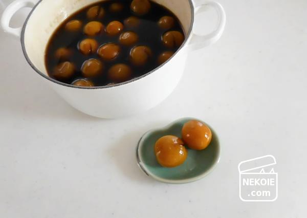 とろみのついた煮汁は、実を取り除いたあとも香りがよくておいしい。これは別に保管しておき、お湯で割ったり紅茶に入れながら「喉に良いシロップ」としていただきます。