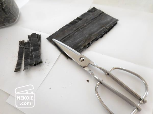 昆布には厚みもあって、時間にも握力にも響く作業。でもこのはさみは刃が薄くサクサク切れるので、以前使っていたものより手が疲れにくく、効率的に進むように思います。