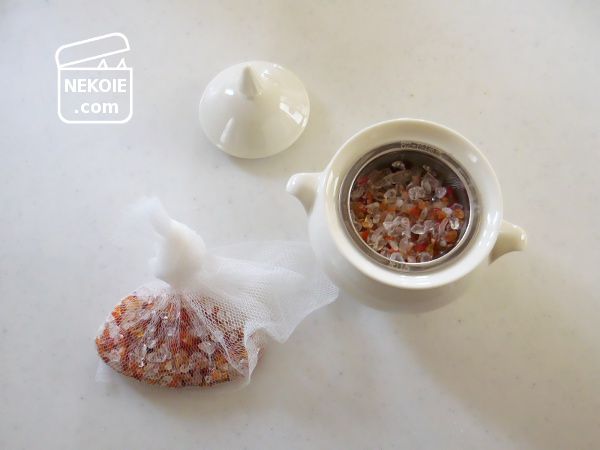 この茶こしを空にした香炉にはめこみ、別途洗っておいたさざれ石はこの中へ。