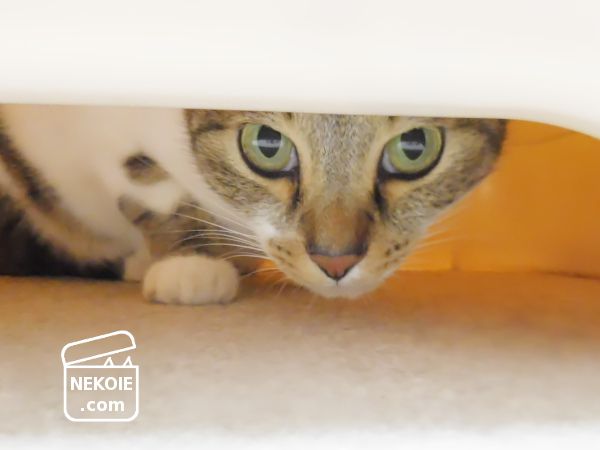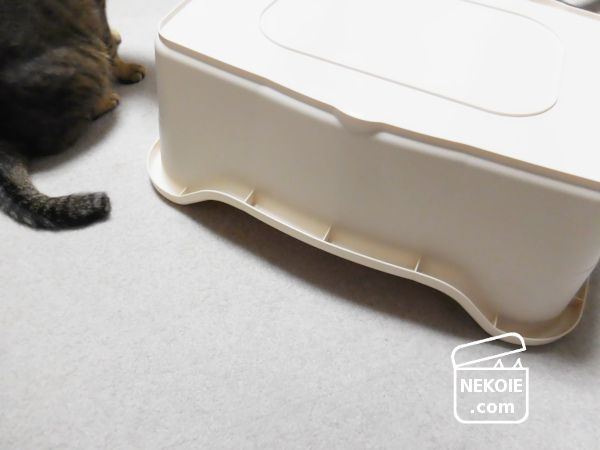 こちら、ひっくりかえっているのは猫たち用に備えている未使用トイレ。防災用品の一つで、普段はベッドとして使っています。