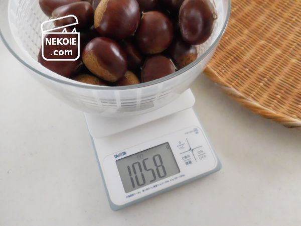 写真の重さは二袋分。一袋が約500gで400円ほど。新鮮な栗がこのくらいで手に入るのはとてもありがたかったです。