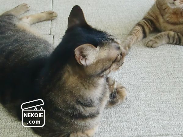 こちらを向いてくれた兄猫の写真を撮ろうとしたら、その瞬間にそっぽを向かれ、こちらを向いてくれた他の兄猫が見切れてしまいました。