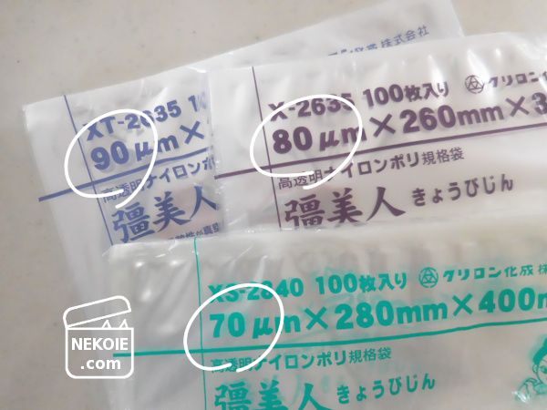 70μmが薄いといっても、一般的なポリ袋と比べたら厚みがあります。身近な製品でいえば、袋タイプのジップロックは0.06mmと記載があるので、60μm。彊美人のシリーズはそれ以上に厚みがあるということ。そして今回は更に厚い袋を試してみることにしました。