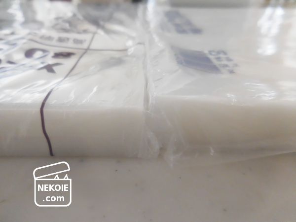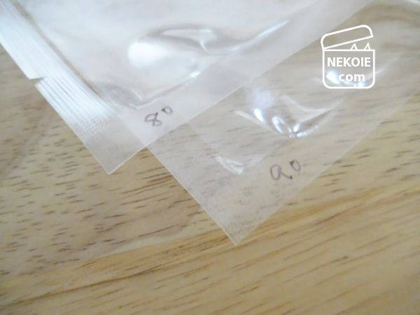 とはいえ正直なところ、見ても、ふれても、そんなに違いは感じません。60μmのジップロックと90μmの彊美人を比べてみれば、たしかに違いがあるような、という程度の差。単体でふれただけだと私には区別がつきませんでした。
