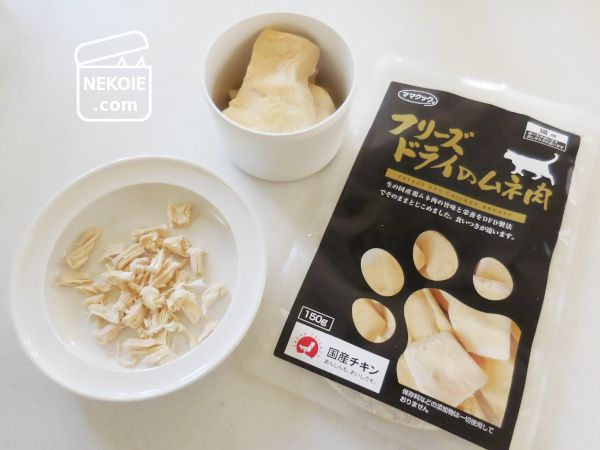 フリーズドライなので乾燥状態の肉。感触としてはふわふわとしたクッション性のある柔らかさで、手で簡単に裂けるものです。