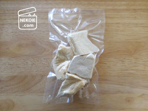 もともと使っていた70μmの袋の最善の用途はなんだろう? と考えたとき、比較的やわらかいものや、角の少ないものがいいのだろうなと。人間用の食品の場合も、表面に骨が出ていない肉や魚といった柔らかいものを(自宅用で)真空パックにするなら70μmでも十分なのかなと思います。