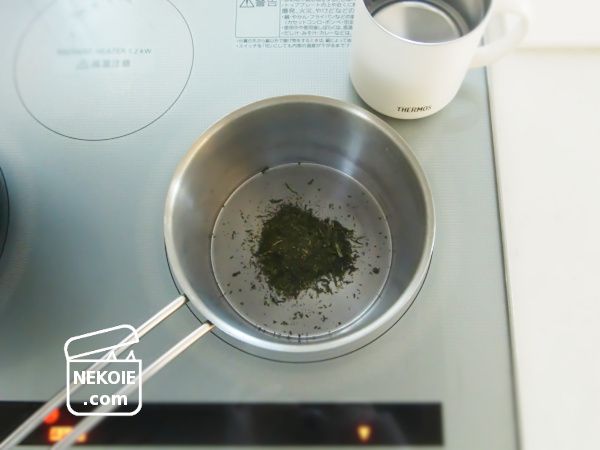 - マグカップの熱湯を小鍋に移し、蓋をして一分蒸らす。