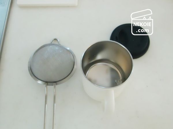 - 小鍋を回すように揺らし、ストレーナーを使ってこしながら、マグカップに戻す。