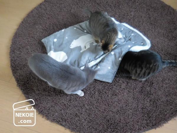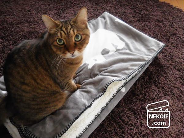 サイズはユニクロのブランケットの二倍くらいと大判。一人で使う場合は小さなほうが便利ですが、今回は「猫たちと一緒に包まる」という用途で使いたかったので、大きなものを求めていたんです。