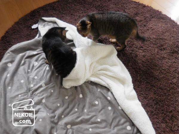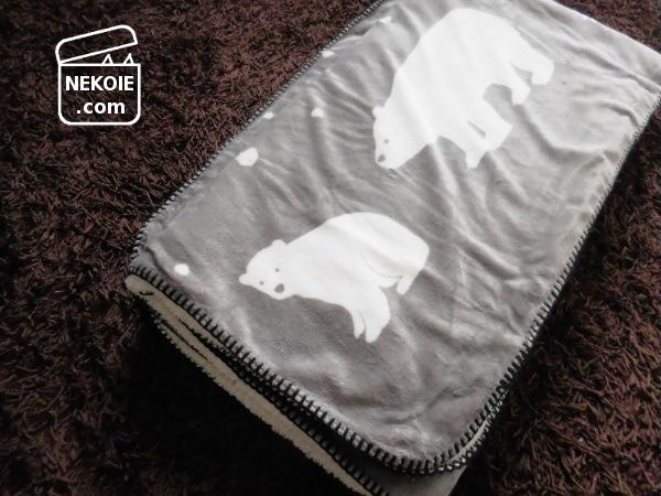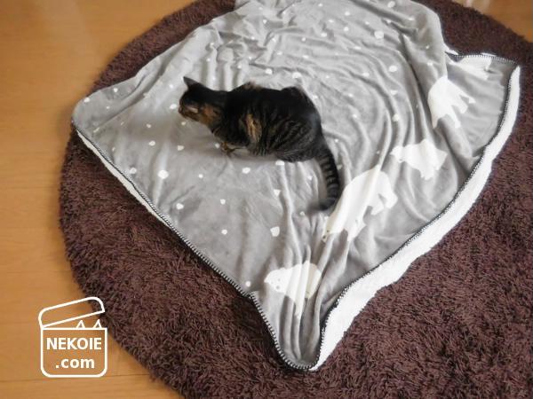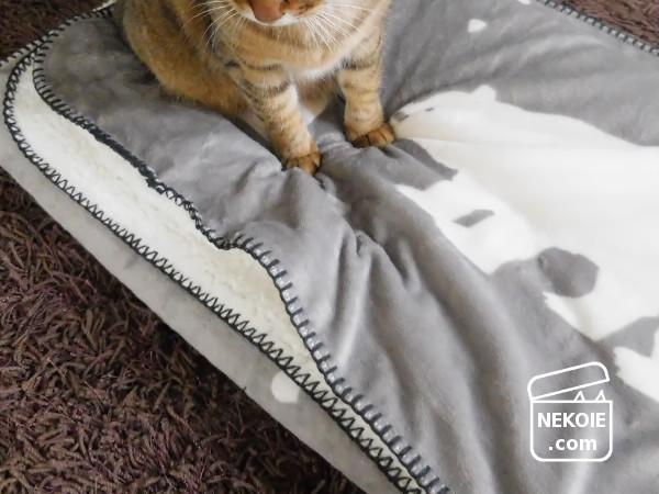 表(柄面)はさらりとした起毛素材で、裏は白のモコモコ。白いほうは猫の毛がついてしまいそうですが、おそらく何を買ってもワンシーズンで手放すことになるので気にしなくてもいいかなと。