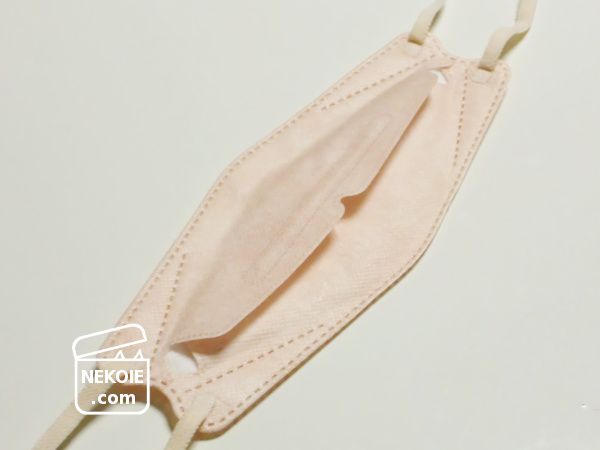 形状としてはよくあるプリーツタイプではなく、口元を三枚の面で覆うようなマスク。立体的になるので唇の動きにも負担がなく、会話もしやすいと思いました。