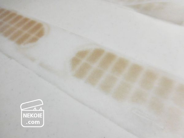 本当なら内側の見えない場所に貼るほうが見た目もよくなり、作業も楽そうだったのですが、吸気する際に一番手前となるフィルター部分に取りつけました。IHコンロなので換気扇は汚れにくいことも想像しつつ、一ヶ月ほど経った頃に外してみたらこのとおり。