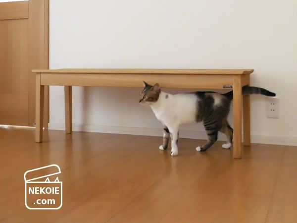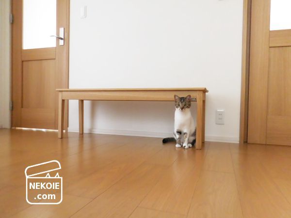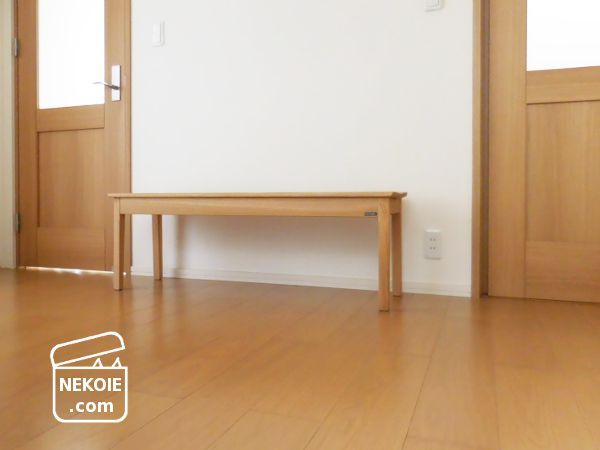 余談ですが、座卓だと脚への負担が心配な方をお迎えすることもあるので、椅子として使うベンチを活用中。ふだんは猫の二段ベッド用にクッションを並べています。