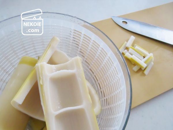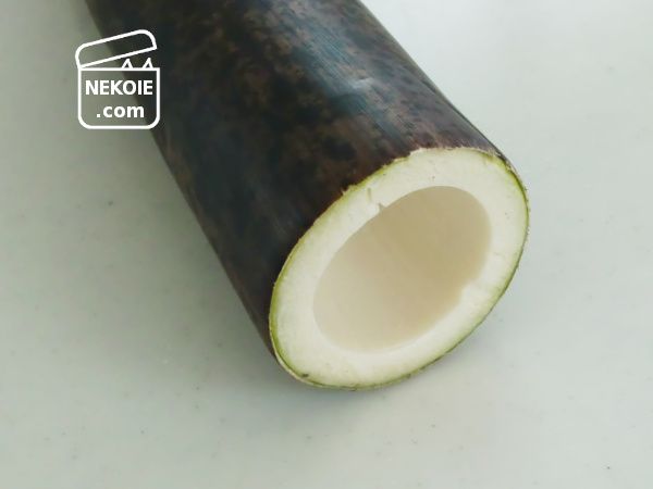 - 真竹を鍋に入るサイズにカット。縦に包丁を入れ、硬い皮は取り除く。