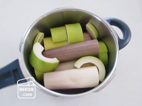 - ひたひたの水を注ぎ、圧力鍋で加熱。ピンが上がったら五分間加圧。