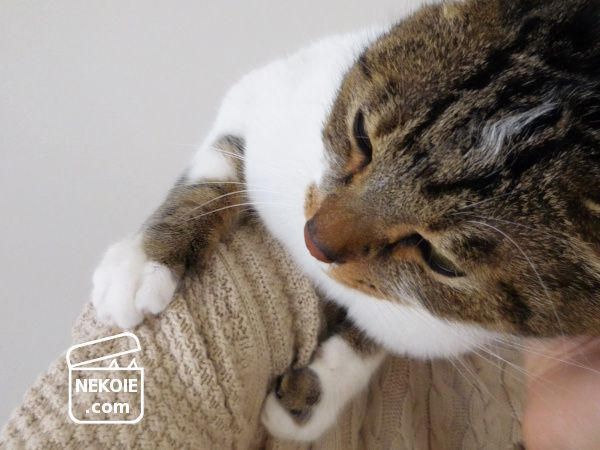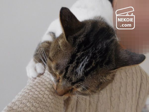 よじのぼってきた猫が肩の上で一休み。小鳥だったら納得できるのだけれど、彼は猫です。