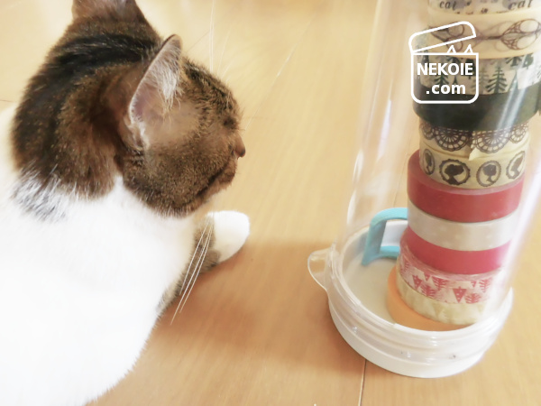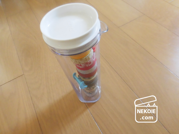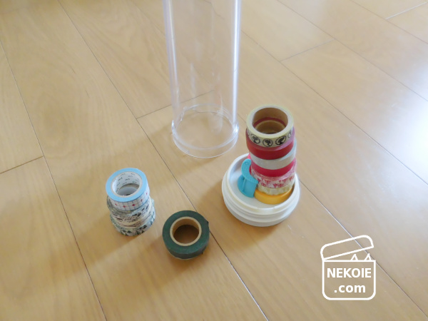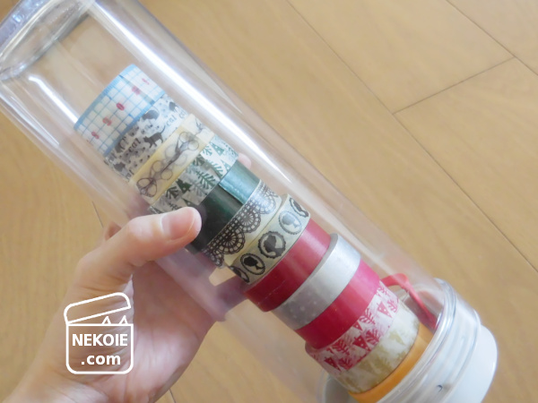 色々な種類をちょっとずつ使いたい柄マステは、積み上げておくことにしました。使ったのは、かつて冷茶ポットだったもの(タケヤのスリムジャグ)です。