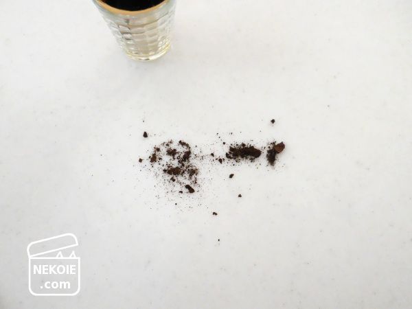 幸いほとんど乾いたあとのコーヒー豆だったので、大した水けもない状態。拭き取るよりも掃除機で吸いこむほうが簡単かなと。水拭きなどで濡らしてしまうと色がにじみ出て、かえって汚くなりそうですし。