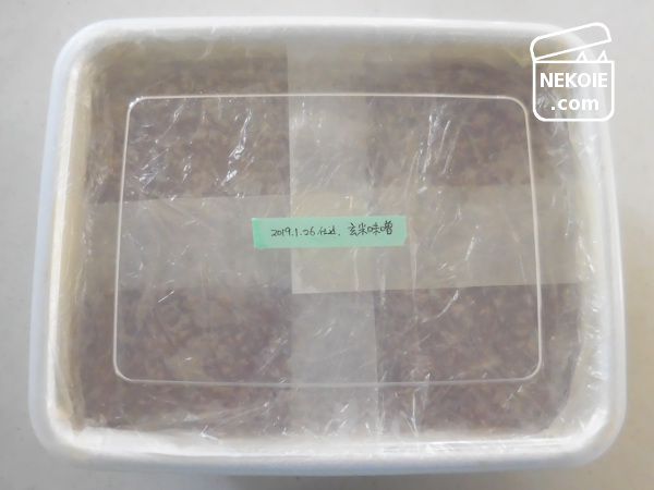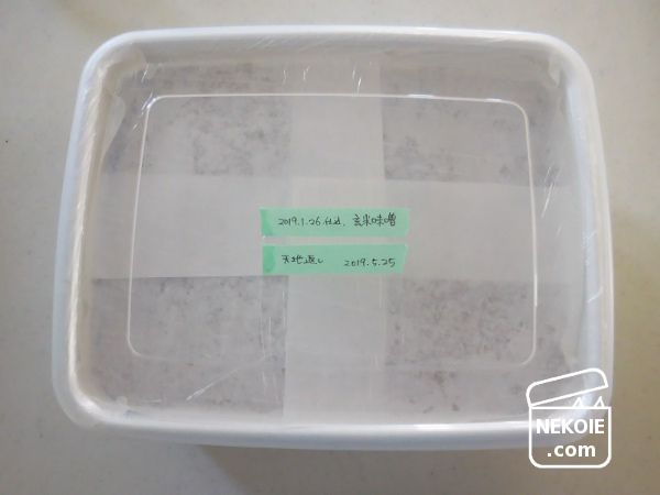 味噌の表面には和紙を敷き、更に容器をラップで覆ってから蓋をしています。この和紙を使う方法を取り入れてから、小さなカビとも無縁になりました。