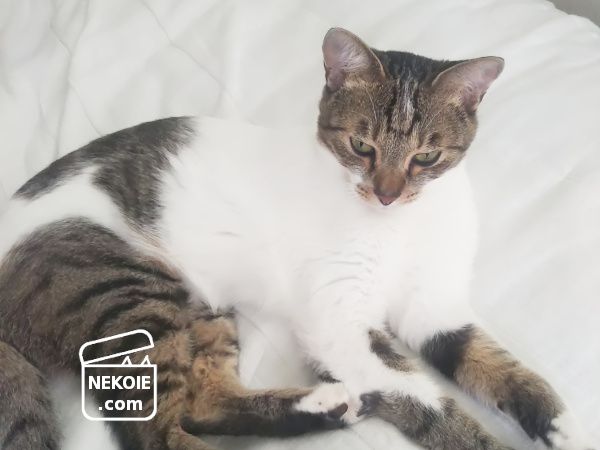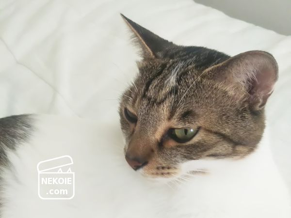 寝具は夏物の麻素材、猫は夏毛でほっそり。